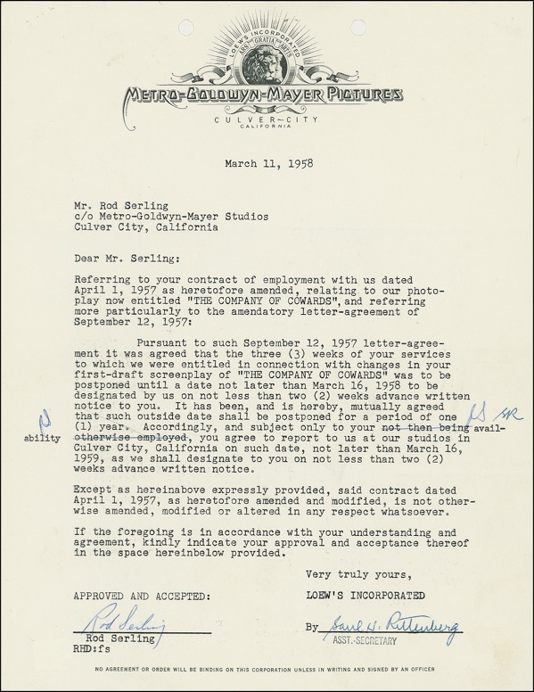 DS, one page, 8.5 x 11, Metro Goldwyn Mayer Pictures letterhead, March 11, 1958. Agreement between MGM and Serling for an amendment to a previous contract for Serling’s draft of a film entitled The Company of Cowards. Signed at the conclusion in blue ballpoint by Serling, who adds his initials along the left edge. In fine condition, with punch and staple holes to top edge and a few light creases. R&R COA.