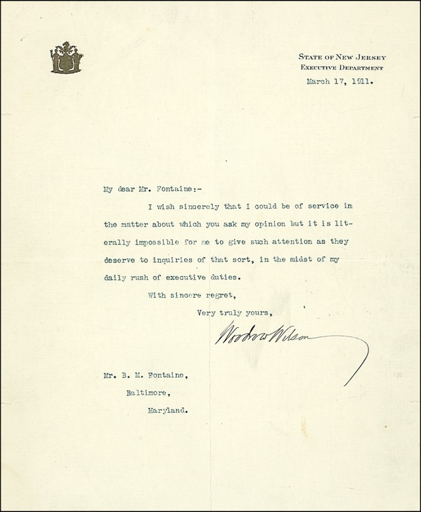 TLS, one page, 8 x 9.75, State of New Jersey letterhead, March 17, 1911. Wilson politely declines comment. In full, “I wish sincerely that I could be of service in the matter about which you ask my opinion but it is literally impossible for me to give such attention as they deserve to inquiries of that sort, in the midst of my daily rush of executive duties. Intersecting mailing folds, some light soiling and a staple hole to top left, otherwise fine condition. LOA John Reznikoff/PSA/DNA and R&R COA.