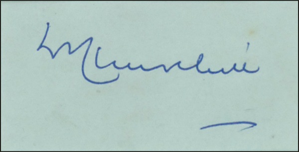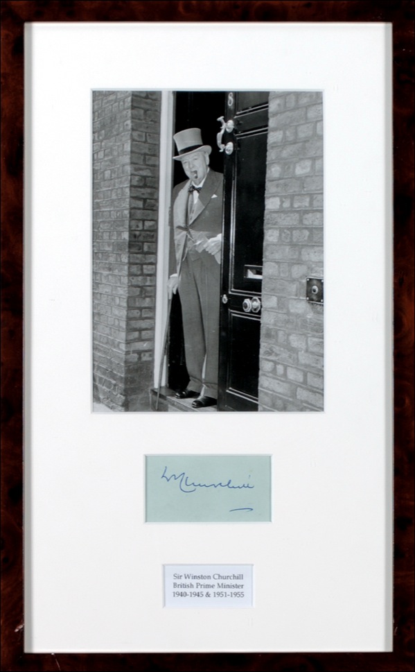 Fountain pen signature, “W. Churchill,” on a light green album page. Matted and framed with a photo of Churchill emerging from his residence, to an overall size of 9.75 x 16. In fine condition, with a bit of scattered light soiling. LOA John Reznikoff/PSA/DNA and R&R COA.