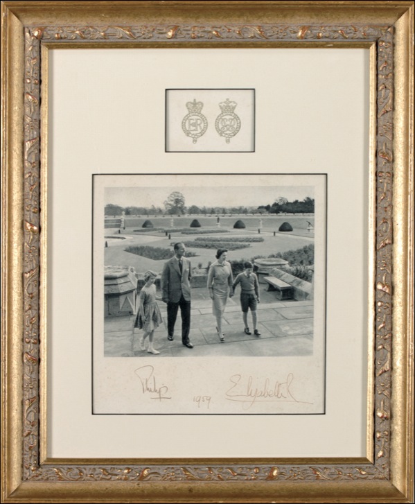 Vintage 7.75 x 8 photo of Elizabeth, Philip and young Prince Charles and Princess Anne at one of their residences, signed in fountain pen in the lower border, “Philip,” and “Elizabeth R,” who adds “1959.” Matted and framed with their royal coat of arms, to an overall size of 13.5 x 16.5. In fine condition, with light overall foxing to borders and a bit of light toning. R&R COA.