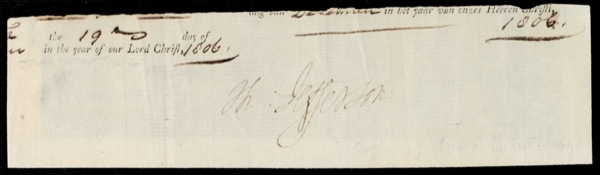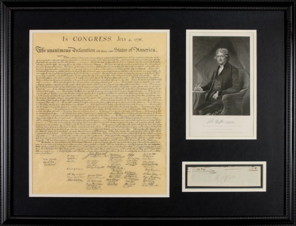 Ink signature, as president, “Th: Jefferson,” on an off-white 6.75 x 2 slip clipped from a four-language ship’s papers, dated 1806. Double matted and framed with an engraved portrait of Jefferson and a copy of the Declaration of Independence, to an overall size of 27.5 x 21. In fine condition, with signature a shade light and thin, light show-through from mounting on reverse and some slight pencil remnants along bottom. LOA John Reznikoff/PSA/DNA and R&R COA. Oversized.