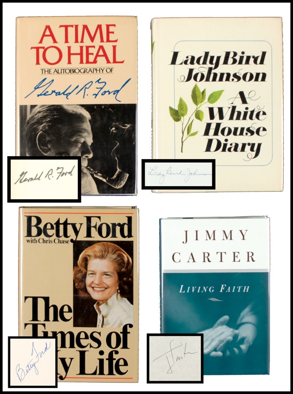 Group of four hardcover books: Living Faith, signed on the first free end page in black ink, “J. Carter”; A Time To Heal, signed in black felt tip on a bookplate affixed to the first free end page by Gerald Ford; A White House Diary, signed in blue ballpoint on a bookplate affixed to the first free end page by Lady Bird Johnson; and The Times of My Life, signed in blue felt tip on a bookplate affixed to the first free end page by Betty Ford. In fine overall condition. R&R COA.