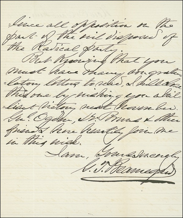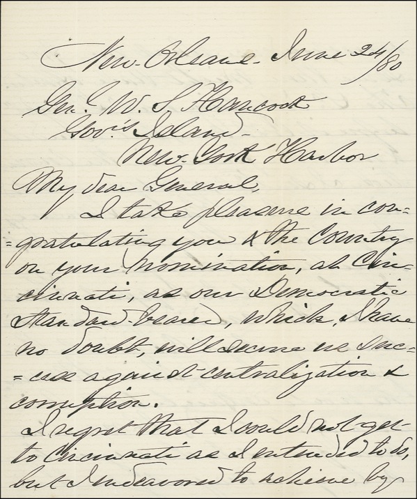 Brigadier General of the Confederate Provisional Army (1818–1893) who commanded the forces at Charleston, where he ordered the bombardment of Fort Sumter. Significant and historic ALS signed “G. T. Beauregard,” three pages on two adjoining lightly-lined sheets, 5 x 6.25, June 24, 1880. Beauregard writes to General Winfield S. Hancock, who had just been nominated for the presidency at the Democratic National Convention. In full: “I take pleasure in congratulating you & the country on your nomination, as Candidate, as our Democratic standard bearer, which, I have no doubt, will secure us success against centralization & corruption. I regret that I could not get to Cincinnati as I intended to do, but I endeavored to achieve by correspondence what my presence there might have effected. The La. delegation was ‘all right’ before it left here, but to aid it & my other friends in the Convention I sent to it, & to your devoted admirer, Col. Blanton Duncan of Ky., the following telegram to be used to the best advantage: ‘South ought to support Hancock. His candidacy would silence cry about Confederate Brigadiers & bloody shirt. Moreover, he would certainly take his seat if elected.’ It remains now for us to elect you by so a large a majority as to silence all opposition on the part of the evil disposed of the Radical party. But knowing that you must have congratulatory letters to read, I will close this one by wishing you a brilliant victory next November. Genl. Ogden, Dr. Brund, and other friends here heartily join me in this wish.” On the reverse of the final page, Hancock has penned a brief summary of Beauregard’s message. Hancock emerged as the victor at the Democratic Convention, which had begun in Cincinnati on June 22, just two days earlier. As Rutherford B. Hayes, the incumbent, had earlier promised not to seek reelection, the Republicans threw their support behind James Garfield, then a congressman from Ohio. With Reconstruction as the chief issue of the campaign, Hancock and Garfield ran neck and neck. Though Garfield ultimately prevailed by a large electoral margin, Hancock lost by fewer than ten thousand popular votes. After effectively retiring from politics, Hancock spent the last few years of his life as president of the National Rifle Association. In fine condition, with unobtrusive folds. LOA John Reznikoff/PSA/DNA and R&R COA.