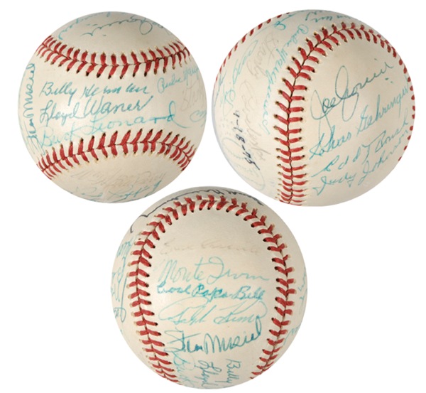 Official Spalding National League baseball signed in ink and ballpoint by twenty-two Hall of Famers. Signers include: Billy Herman (ss), Lloyd Waner (ss), Buck Leonard (ss), Earl Averill, Monte Irvin, Cool Papa Bell, Ralph Kiner, Stan Musial, Rube Marquard, Yogi Berra, Stan Coveleski, Bill Terry, Red Ruffing, Jocko Conlan, Waite Hoyt, Burleigh Grimes, George Kelly, Hank Greenberg, Joe Cronin, Chas. Gehringer, Edd Roush and Judy Johnson. Ball also bears a signature of Roy Campanella, which has been signed by Mrs. Roy Campanella. In fine condition, with a bit of mild toning, several signatures a couple shades light, but legible and a couple more difficult to read. LOA Steve Grad/PSA/DNA and R&R COA.