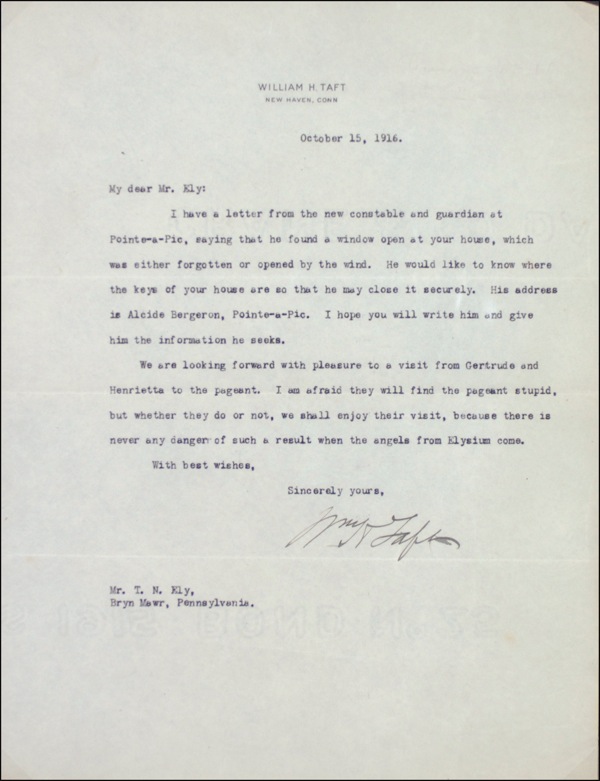 TLS signed “Wm. H. Taft,” one page, 8 x 10.5, personal letterhead, October 15, 1916. Letter to his neighbor at Pointe-a-Pic. In part, “I have a letter from the new constable and guardian at Pointe-a-Pic, saying that he found a window open at your house, which was either forgotten or opened by the wind. He would like to know where the keys of your house are so that he may close it securely…We are looking forward with pleasure to a visit from Gertrude and Henrietta to the pageant. I am afraid they will find the pageant stupid, but whether they do or not, we shall enjoy their visit, because there is never any danger os such a result when the angels from Elysium come.” Archivally shadow box framed with a gold-inlaid, sterling silver portrait plate issued in a limited edition by the Franklin Mint in the early-to-mid 1970s, to an overall size of 28.5 x 20. In fine condition. R&R COA. Oversized.