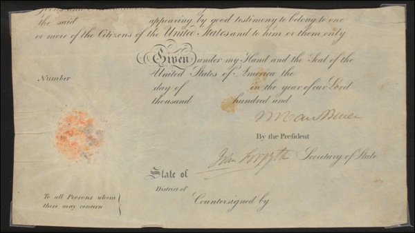 Partial DS as President, signed “M. Van Buren,” one page on vellum, 10.5 x 6, no date [1837–1841]. The bottom portion of an unaccomplished passport, countersigned by Secretary of State John Forsyth. Archivally shadow box framed with a gold-inlaid, sterling silver portrait plate issued in a limited edition by the Franklin Mint in the early-to-mid 1970s, to an overall size of 20 x 26. In very good condition, with seal stain and small edge tear to blank portion and a few light spots and wrinkles. Despite these points, whose visual impact is minimal, the signature itself is perfect and completely unaffected, and easily rates very fine. R&R COA. Oversized.