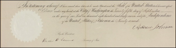 Partial DS as President, one page, 17 x 6.5, September 25, 1867, also signed by Secretary of State William Seward. Final paragraph of a larger document, instructing the Secretary of State to affix the seal of the United States to the document. Archivally shadow box framed with a gold-inlaid, sterling silver portrait plate issued in a limited edition by the Franklin Mint in the early-to-mid 1970s and a color portrait, to an overall size of 25.5 x 24.5. In fine condition, with a repair to a bisecting vertical separation and worn but intact seal. R&R COA. Oversized.