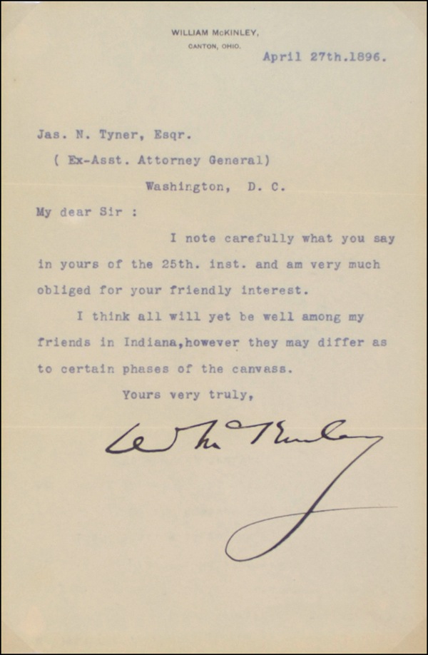 TLS signed “W. McKinley,” one page, 5.5 x 8.5, personal letterhead, April 27, 1896. Letter to ex-Assistant Attorney General James Tyner. In full, “I note carefully what you say in yours of the 25th inst. and am very much obliged for your friendly interest. I think all will yet be well among my friends in Indiana, however they may differ as to certain phases of the canvass.” Accompanied by the original mailing envelope, addressed in another hand to Tyner. Archivally shadow box framed with a gold-inlaid, sterling silver portrait plate issued in a limited edition by the Franklin Mint in the early-to-mid 1970s and the envelope, to an overall size of 18 x 33.5. When Rutherford B. Hayes was inaugurated as President in 1877, he appointed his own postmaster general but retained Tyner in the department as first assistant. Perhaps because of this demotion, Tyner contributed to massive corruption within the department. Tyner’s practices soon became known; he was criticized in the press and was forced to resign his position. The scandal, however, did not end his political career. President Benjamin Harrison named Tyner assistant attorney general inside the Post Office Department, a position he retained throughout several other administrations. An investigation of the Post Office department ordered by President Theodore Roosevelt in 1902 revealed that Tyner again had engaged in corruption. Tyner took steps to hide his involvement -- he sent his wife and sister-in-law to his office to destroy evidence -- and though he was indicted, he was eventually acquitted due to lack of hard evidence. James Noble Tyner was forced to resign in 1902 and died in 1904. In very good condition, with expected folds, a mild shade of toning and several pencil notations to envelope. McKinley’s signature remains as bold as the day he signed the letter. R&R COA. Oversized.