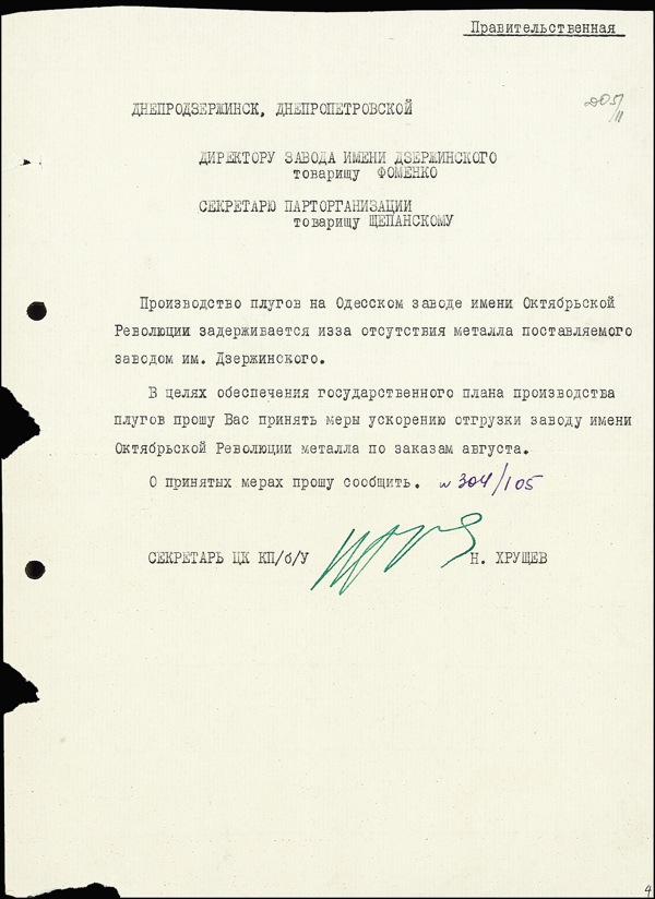 Dynamic, often belligerent, highly influential leader of the Soviet Union (1894–1971) from 1953, when he came to power upon the death of Stalin, to 1964, when he was forced to retire by his own party. Typed DS, one page, 7.75 x 10.5, no date. An official document signed at the conclusion in green ink. Punch holes with related tears and chips (confined to left margin and well away from text and signature) and chip to bottom edge, otherwise fine condition. Auction LOA John Reznikoff/PSA/DNA and R&R COA.