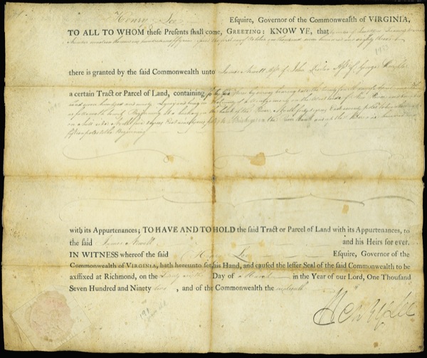 Revolutionary War hero (1756–1818), father of Robert E. Lee, who captured British posts in New York and in the South and who later served in the Continental Congress. Partially printed DS, one page on vellum, 14.5 x 12, March 26, 1792. A document, signed by Lee as Governor of Virginia, granting a parcel of land in Montgomery County to James Newell. The embossed paper seal remains intact at lower left. In very good condition, with scatted toning and soiling, a few small spots, and a few small holes along folds. The signature is large, dark, and mostly unaffected. R&R COA.