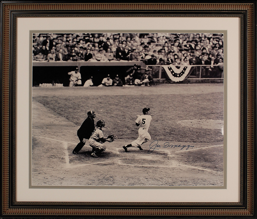 Spectacular satin-finish 20 x 16 photo of DiMaggio following his hit at the plate, signed in blue felt tip. Matted and framed to an overall size of 26.5 x 22.5. In very fine condition. Oversized. Pre-certified Steve Grad/PSA/DNA and RR Auction COA.