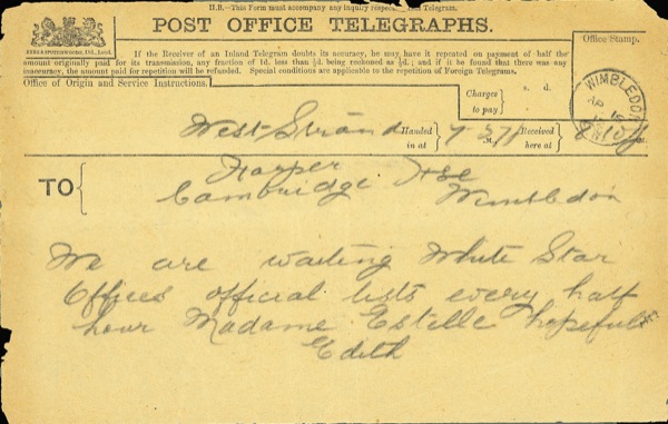 Manuscript in telegram in pencil, signed “Edith,” 8.5 x 5.5 on a preprinted British Post Office Telegraphs form, April 15, 1912. A message to Harper House, Cambridge, Wimbledon. In full: “We are waiting White Star Offices official lists every half hour Madame Estelle hopeful.” The RMS Titanic hit the infamous iceberg at 11:40 p.m. on April 14 and sank in the early morning hours of April 15. The “Harper House” address suggests that the passengers in question were Mr. and Mrs. Henry Harper, who were first-class passengers (and survivors). In very good condition, with light even toning, folds, and a few small edge chips. R&R COA.