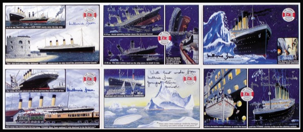 Youngest survivor of the Titanic tragedy (born February 2, 1912). Set of six color souvenir postcards depicting the Titanic, each signed on the image in ink or felt tip. In very fine condition. R&R COA.