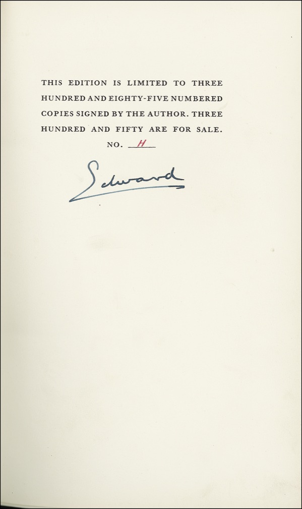 King of England from January to December 1936, at which time he abdicated the throne to marry American divorcée Wallis Warfield Simpson. Signed book: A King’s Story: Memoirs of the Duke of Windsor. Limited edition of 385 signed copies, 350 for sale (this a not-for-sale copy lettered “H”). NY: G. P. Putnam’s Sons, 1951. Red morocco-bound hardcover, 6.5 x 9.5, 435 pages. Boldly signed in fountain pen on the limitation page, “Edward.” A few spots of rubbing to binding at extremities, otherwise fine, clean condition. Auction LOA John Reznikoff/PSA/DNA and R&R COA.