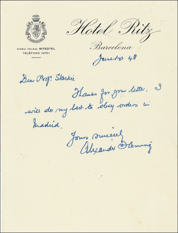 Scottish bacteriologist (1881–1955) who shared the 1945 Nobel Prize in Medicine for his role in the discovery and isolation of penicillin. ALS, one page, 5.5 x 7.25, Hotel Ritz, Barcelona letterhead, June 1, 1948. Fleming writes to Professor Slarkie. In full: “Thanks for your letter. I will do my best to obey orders in Madrid.” Fleming journeyed to Spain in 1948 to receive the Grand Cross of Alphonse X the Wise for his scientific achievements. In fine condition. R&R COA.