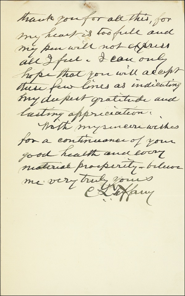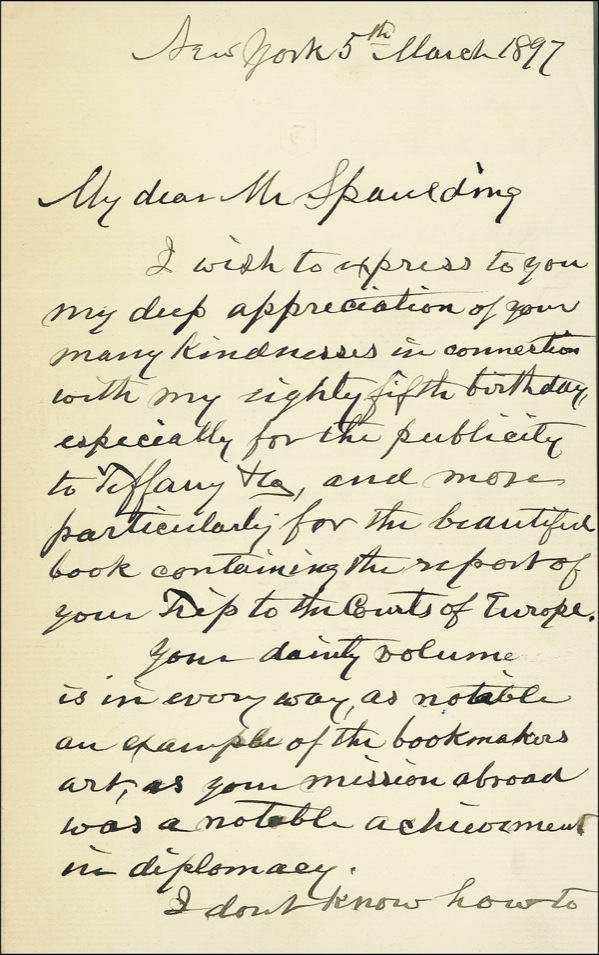 Founder of the great New York–based retail and design operation (1812–1902) that became legendary for its spectacular jewelry and decorative wares in metal, glass, and other materials. ALS signed “C. L. Tiffany,” two pages, 5 x 8, personal letterhead, March 5, 1897. Tiffany writes to Mr. Spaulding. In part: “I wish to express to you my deep appreciation of your many kindnesses in connection with my eighty-fifth birthday, especially for the publicity to Tiffany & Co., and more particularly for the beautiful book containing the report of your trip to the courts of Europe. Your dainty volume is in every way as notable an example of the bookmaker’s art as your mission abroad was a notable achievement in diplomacy.” In fine condition, with mailing fold touching the faintly-brushed signature, and small tear and marginal show-through from adhesive traces on reverse of second page. Auction LOA John Reznikoff/PSA/DNA, and R&R COA.