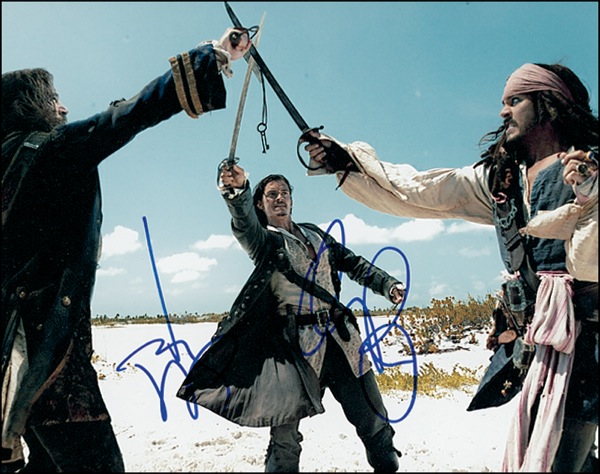 Color satin-finish 10 x 8 photo of the three-way sword duel from Pirates of the Caribbean: Dead Man’s Chest, signed in blue felt tip by Johnny Depp and Orlando Bloom. In very fine condition. R&R COA.