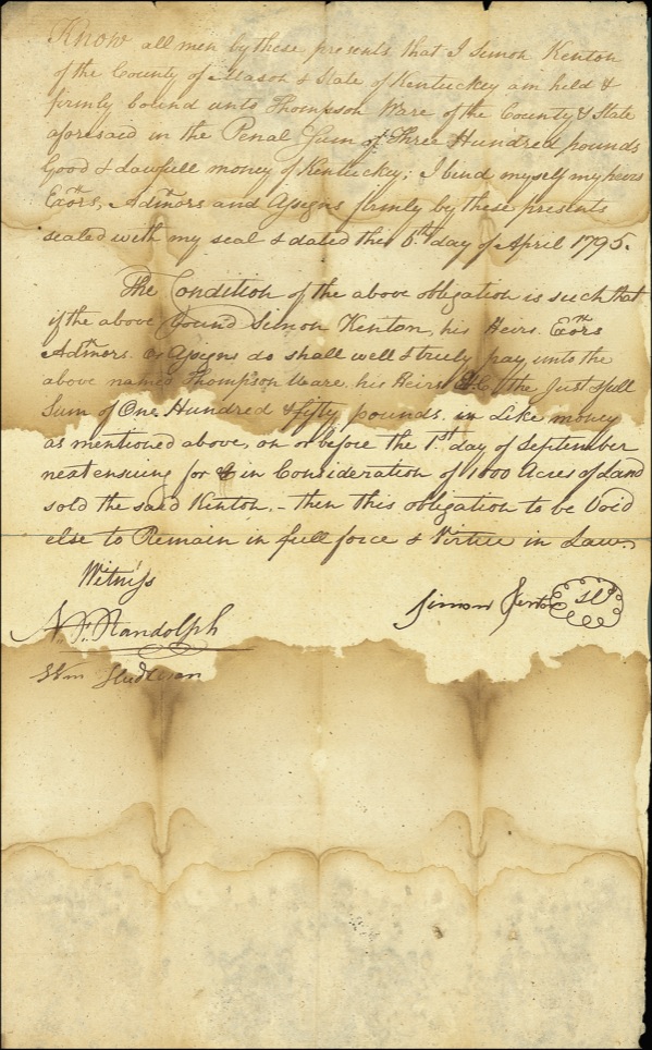 Kentucky frontiersman. He was active in the defense of the frontier - he is credited with saving Boone’s life during an Indian attack at Boonesburough. DS, one page, 8 x 13, April 6, 1795. Legal document concerning a settlement paid by Kenton. In full, “Know all men by these presents that I Simon Kenton of the County of Mason & State of Kentucky am held & firmly bound unto Thompson Ware of the County & State aforesaid in the Penal Sum of Three Hundred pounds Good & Lawful money of Kentucky; I bend myself my heirs Exors, Admors and Assigns firmly by these presents sealed with my seal and dated this 6th day of April 1795. The Condition of the above obligation is such that if the above bound Simon Kenton his Heirs Exors Admors or assigns do shall well & truly pay unto the above named Thompson Ware his Heirs & c the just & full sum of One Hundred & fifty pounds in like money as mentioned above, on or before the 1st day of September next ensuing for & in consideration of 1000 acres of land sold the said Kenton then this obligation to be void else to remain in full force & virtue in Law.” In good condition, with scattered toning and water staining, affecting appearance but surprisingly not the signature, and a repair to the separation along the bisecting horizontal fold. Auction LOA John Reznikoff/PSA/DNA and R&R COA.