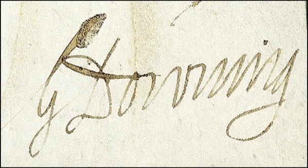 British politician (1623–1684) for whom Downing Street, site of the Prime Minister’s residence, is named. Manuscript DS on vellum, in Latin, signed “G. Downing,” one page, 13.25 x 2, 1665. An untranslated document mentioning Parliament. Light wrinkling and a hint of mild soiling, otherwise fine condition. R&R COA.