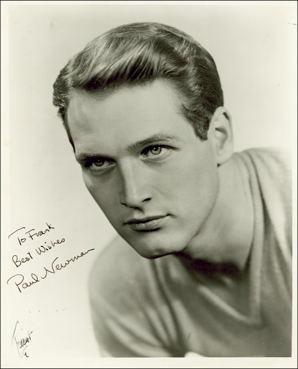 Vintage glossy 8 x 10 photo of the young actor, signed and inscribed in fountain pen “To Frank, Best wishes, Paul Newman.” Light corner bends and a few surface impressions, otherwise fine, crisp condition. R&R COA.