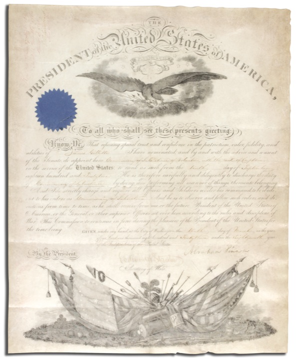 War-dated DS as president, one page, 13 x 16.5, March 10, 1863. Lincoln appoints James Gillette to the position of “Commissary of Subsistence of volunteers with the rank of Captain.” Signed at the bottom in black ink, “Abraham Lincoln,” and countersigned by Secretary of War Edwin Stanton. Matted to an overall size of 18 x 22. In very good condition, with even overall toning, mild foxing to edges, previous intersecting storage folds and Stanton’s signature fairly light, but legible. A week earlier, on March 3, Lincoln signed the Conscription Act, the controversial draft law that mandated the impressment of all able-bodied young men into the service of the Union Army. A clause allowing for a “rich man’s exemption” by payment of a fee or recruitment of a substitute provoked nationial fury, leading to riots in New York City during that same summer. Ultimately, the Conscription Act was ineffective, and Lincoln turned to more unashamedly mercenary means to keep the forces manned. Auction LOA John Reznikoff/PSA/DNA and R&R COA.