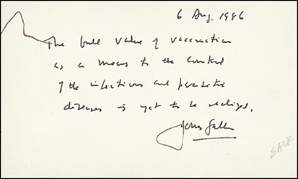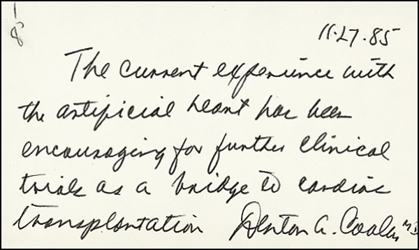 AQSs by both doctors on opposite sides of an off-white 5 x 3 card. Salk writes: “The full value of vaccination as a means to the control of the infectious and parasitic diseases is yet to be realized.” On the reverse, Cooley writes: “The current experience with the artificial heart has been encouraging for further clinical trials as a bridge to cardiac transplantation.” Stray ink mark touching one word of Salk’s quotation and very subtle show-through, otherwise fine condition. R&R COA.