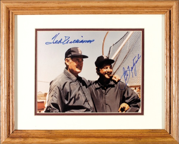 Color satin-finish 10 x 8 photo of Williams and Yastrzemski posing together by a batting cage, signed in blue felt tip by both Ted Williams and Carl Yastrzemski. Double matted and framed to an overall size of 16.5 x 13.5. In very fine condition. Auction LOA Steve Grad/PSA/DNA and R&R COA.