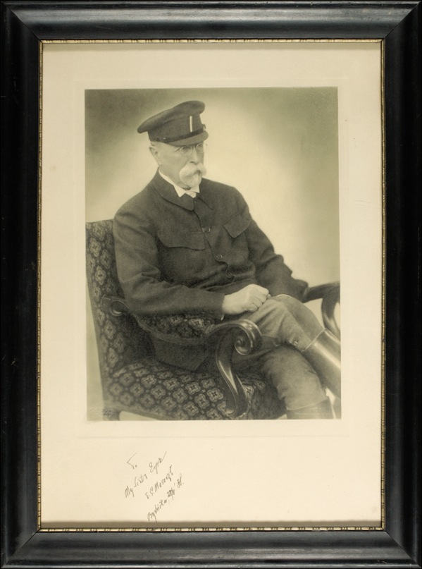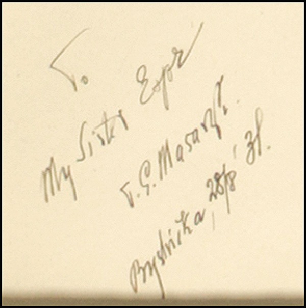 Czech statesman (1850–1937) who was one of the founders and first president of Czechoslovakia. Dignified vintage matte-finish 8.75 x 11.25 photo of Masaryk seated in a parlor chair, affixed to the original 11.75 x 16.5 photographer’s mount, signed and inscribed in fountain pen on the mount “To my sister Espr, T. G. Masaryk, Brysnika, 28/8 ‘31.” Framed to an overall size of 14.5 x 19.5. In fine condition, with a bit of scattered light silvering. R&R COA.