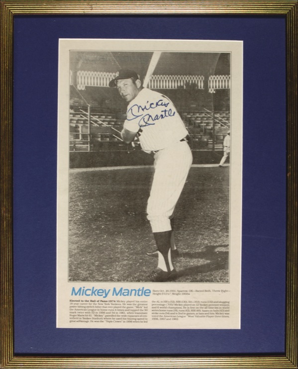 Fabulous and oversized 10.5 x 16.5 full-length program photo of Mantle in his batting stance at Yankee Stadium, complete with a career biography at the bottom, signed in blue felt tip. Matted and framed to an overall size of 17.5 x 21.5. In fine condition. Auction LOA Steve Grad/PSA/DNA and R&R COA.