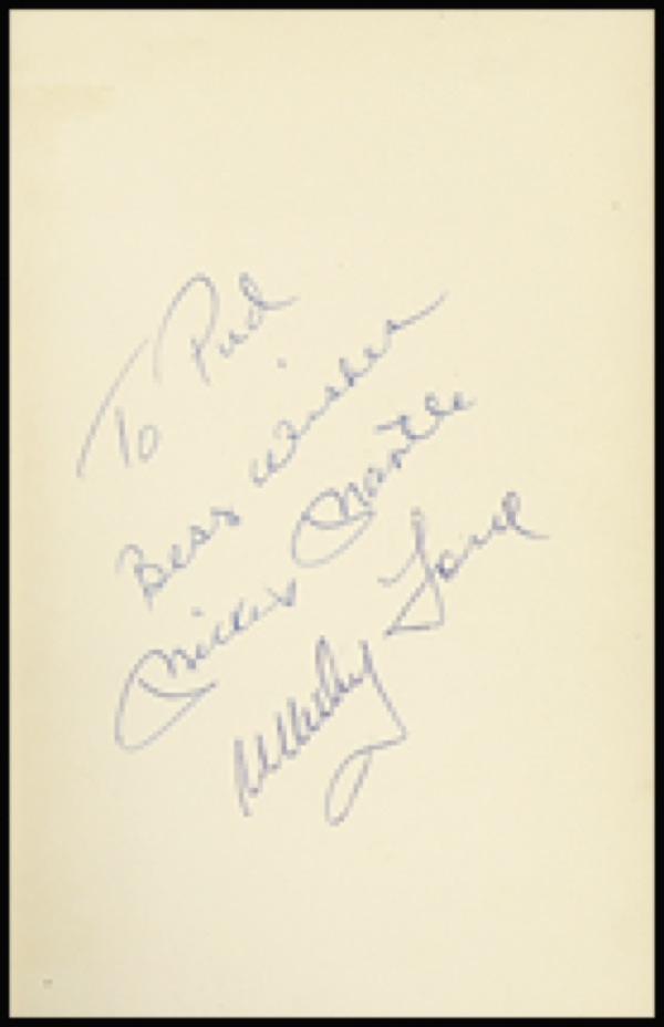 Signed book: The Quality of Courage. NY: Doubleday and Co., 1964. Hardcover with dustjacket, 5.75 x 8.5, 185 pages. Signed and inscribed on the first free end page, “To Pud, Best wishes, Mickey Mantle,” and also signed by Whitey Ford. In fine condition, with some light wear and tear to dustjacket. Auction LOA Steve Grad/PSA/DNA and R&R COA.