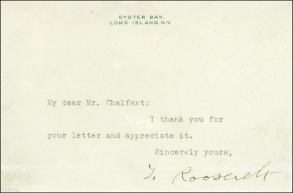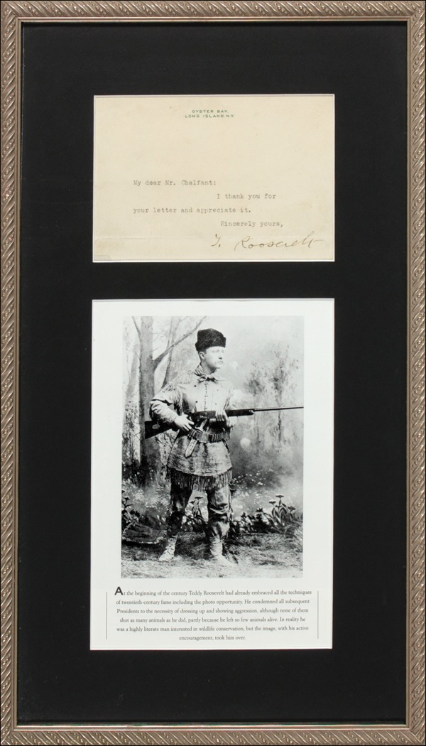TLS signed “T. Roosevelt,” one page, 6 x 4.25, Oyster Bay letterhead, no date. Brief letter of thanks. In full, “I thank you for your letter and appreciate it.” Double matted and framed with a book photo of a young Roosevelt, to an overall size of 10.75 x 18.25. In fine condition, with a bit of light toning and a horizontal fold through tops of a couple of letters. Auction LOA John Reznikoff/PSA/DNA and R&R COA.