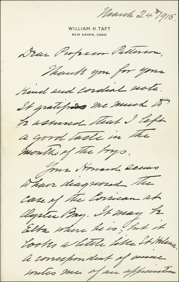 ALS signed “Wm. H. Taft,” two pages, 5 x 7.75, personal letterhead, March 24, 1915. Taft writes to Professor A. H. Patterson at the University of North Carolina. In part: “Your Howard seems to have diagnosed the case of the Corsican at Oyster Bay [i.e., Roosevelt]. It may be Elba where he is, but it looks a little like St. Helena. A correspondent of mine writes me of an appreciation of T.R.’s genius by a speaker who said, ‘T. R. is a greater naturalist than Burbank who can only make one vegetable or fruit out of another, because T. R. has succeeded in making a bull moose into a goat.’” Accompanied by the original mailing envelope addressed in Taft’s hand. In fine condition, with a touch of mild soiling and a few faint brushes and small smudges. Auction LOA John Reznikoff/PSA/DNA and R&R COA.