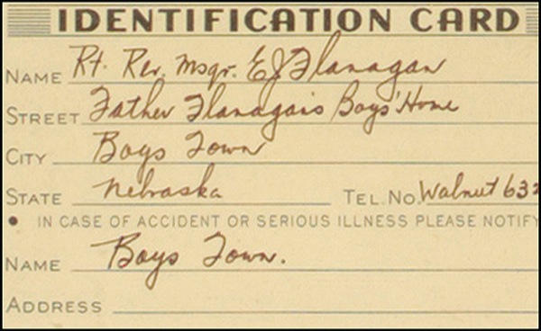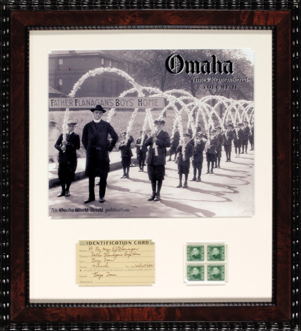 American Roman Catholic priest (1886–1948) best known for founding Boys Town, where he espoused an education-based approach to reforming “wayward” youths. He was immortalized onscreen by Spencer Tracy in the 1938 film Boys Town, for which Tracy won an Academy Award. Beige identification card, 3.75 x 2.5, filled out by Flanagan with his name, “Rt. Rev. Msgr. E. J. Flanagan,” his street, “Father Flanagan’s Boys Home,” and listing his city and emergency contacts, both being Boys Town. Matted and framed with a block of four Costa Rican postage stamps and a nice photo, to an overall size of 14 x 15.25. In fine condition. R&R COA.