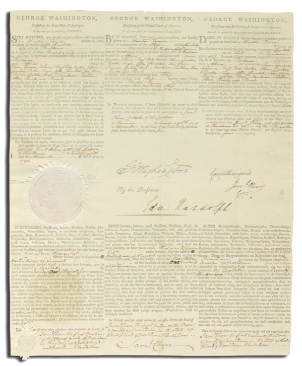 Partially printed DS as president, signed “G. Washington,” one page, 12.5 x 15, November 28, 1794. Spectacular three-language ship’s papers, printed in French, English and Dutch (as was standard at that time; four-language papers including Spanish were not yet customary). The text reads, in part: “Be it known, that leave and permission, are hereby given to Martin Benson, master and commander of the ship called Charlotte of the burthen of one hundred & Forty-seven tons or thereabouts, lying at present in the port of Providence bound for Africa and laden with Rum, Geneva Tobacco, Beef, Pork, Oysters, Four, Crackers, Butter, Sugar, Coffee, Chocolate, Tea, Wine, Raisins, Candles, Soap, Ribbons, Shoes, Bricks, and Board to depart and proceed with his said ship on his said voyage, such ship having been visited and the said Martin Benson having made oath before the proper officer, that the said ship belongs to one or more of the citizens of the United States of America, and to him or them only.” Washington has signed in the middle portion of the document, which has also been countersigned by his Secretary of State, Edwin Randolph, the Port Collector, and Justice Samuel Chase. Research provided by Brown University indicates that in 1794, business partners Nicholas Brown, Jr., George Benson, and Thomas Ives dispatched the ship Charlotte to the newly formed African colony of Freetown, a home for repatriated former slaves, in an attempt to establish legitimate trade with that colony. The ship was commanded by Benson's half brother, slave trader Martin Benson, who was specifically instructed not to take any slaves on board for any reason. However, the trip did not go well, and after much of the cargo was destroyed as the result of a leaky hull, Benson disposed of the remainder and sailed home. The firm of Brown, Benson, and Ives thereafter lost interest in the African trade, but Martin Benson returned to Africa on a “slaving” voyage a year later. In fine condition, with light storage folds, one vertical fold passing inconsequentially through Washington's signature, a few trivial spots of paper loss along folds, and a small area of seal-related toning at lower left from seal. Both paper seals are intact, and Washington's signature rates a 10 out of 10. The combination of outstanding appearance and the significant association with the slave trade and early abolitionist sentiment—Washington himself was a slave owner—make for a document of exceptional interest and desirability. Auction LOA John Reznikoff/PSA/DNA and R&R COA.