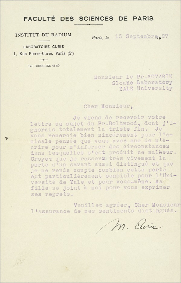 Eminent Polish-French scientist (1867–1934) who won Nobel Prizes in Physics (1903) and Chemistry (1911). Her discovery of the elements of radium and polonium and her subsequent experiments revolutionized the understanding of radioactivity and proved to be one of most far-reaching scientific developments of the twentieth century. Scarce TLS in French signed “M. Curie,” one page, 5.25 x 8.25, Faculté des Sciences de Paris letterhead, September 15, 1927. Curie writes to Professor Kovarik at the Sloane Laboratory at Yale University. In full (translated): “I just received your letter concerning Professor Boltwood, I had absolutely no idea about his sad end. I sincerely thank you for your thoughtfulness in writing me to inform me of the circumstances in which this tragedy occurred. Believe that I feel very deeply the loss of such distinguished scientist and that I realize how much this loss is particularly sensitive to you and Yale University. My daughter joins me in expressing our regrets.” American chemist Bertram Borden Boltwood (1870–1927) discovered that radium is a disintegration product of uranium, providing an important insight into Curie’s original discovery of radium and laying the groundwork for the development of radiometric dating. Accompanied by the original mailing envelope. A touch of very subtle soiling to blank portion, otherwise very fine, bright condition. Auction LOA John Reznikoff/PSA/DNA and R&R COA.