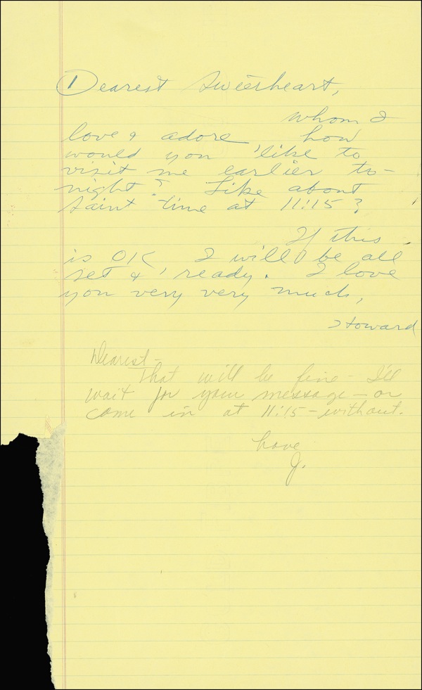 ALS signed “Howard,” one lightly lined yellow page, 8.5 x 14, no date [circa August 1965]. A communication between Hughes and his wife, the actress Jean Peters (1926–2000). The letter takes the form of one of the famous handwritten legal-sheet “memos” that became the billionaire’s preferred form of communication during the final years of his life, when he actively avoided all contact with the outside world. Hughes writes: “Dearest Sweetheart, Whom I love & adore, how would you like to visit me earlier tonight? Like about Saint time at 11:15? If this is OK, I will be all set & ready. I love you very much.” Underneath, in pencil, Peters responds: “Dearest—That will be fine—I’ll wait for your message—or come in at 11:15—without. J.” On the reverse, Hughes pens an erratic response: “They are still postponing Saint. That SOB cost this country a tremendous loss of prestige. He ought to be shot. She is so F— artificial. I am going to work all night & most of it our projects. Is that a part of his swallowing and digesting process? I just said I know you didn’t enjoy it. I gonna fly straight. A Giant pitcher hit a Dodger catcher on head with bat in game today & I want to hear how he was. If you wake up later let me know. I love you. hyperbolicly [sic].” In 1957, shortly before Hughes retreated from public view, he married Peters, then recently divorced from her first husband, Texas oilman Stuart Cramer. With his characteristic controlling “thoroughness,” Hughes supervised virtually every aspect of Peters’ life until their divorce in 1971. The divorce settlement guaranteed Peters a lifetime stipend of $70,000 per year, adjusted for inflation, in return for which she waived all claims to Hughes’ estate—an unexpectedly fortuitous arrangement for her, given the chaos that attended the settlement of Hughes’ will over the course of several years. For her part, Peters demonstrated an unusual loyalty to Hughes even after his death, refusing lucrative offers to reveal the details of the unusual marriage “arrangement” in which she seldom even saw him in person. Bisecting horizontal fold, 5.5″ vertical strip of paper loss to lower left, and a few creases, otherwise fine condition. A scarce and fascinating relic from the very heart of the legendary billionaire’s personal “darkness!” Auction LOA John Reznikoff/PSA/DNA and R&R COA.