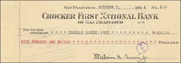 FBI agent and archetypical “G-Man” (1903–1960) responsible for the capture of John Dillinger, “Pretty Boy” Floyd, “Baby Face” Nelson, and other notorious baddies. Check, 8.5 x 3, filled out in type and signed by Purvis, “Melvin H. Purvis, Jr.,” payable to Charles Daniel Frey for $500.00, October 7, 1936. Vertical fold to right side, expected holes and a staple hole and crease to left side, otherwise fine condition. R&R COA.