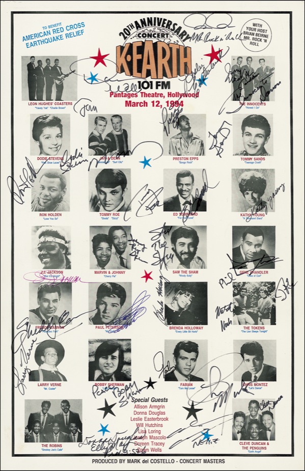 Promotional poster for a 1994 benefit concert, 11 x 17, signed in felt tip by approximately twenty-four, including Brian Beirne, Leslie Easterbrook, The Innocents, Preston Epps, Tommy Sands, Jan and Dean, Dodie Stevens, Ron Holden, Tommy Roe, Ed Townsend, Kathy Young, J. J. Jackson, Johnny of Marvin & Johnny, Sam the Sham, Gene Chandler, Freddy Canon, Paul Peterson, Brenda Holloway, The Tokens, Larry Verne, Bobby Sherman, Fabian, Chris Montez, Donna Douglas, and Cleve Duncan. Light edge wear, otherwise fine condition. R&R COA.