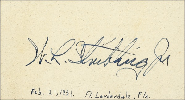 Promising American boxer (1904–1933), known as King of the Canebrakes, who knocked out 125 opponents (a record topped only by Archie Moore). He died in a motorcycle accident at the age of twenty-eight and was inducted into the Boxing Hall of Fame in 1996. Scarce ink signature, “W. L. Stribling, Jr.,” on an off-white 3.5 x 2 card. A small collector’s ink notation indicates that the signature was obtained in Fort Lauderdale on February 21, 1931. A hint of very subtle soiling, otherwise fine, crisp condition. Auction LOA Steve Grad/PSA/DNA and R&R COA.