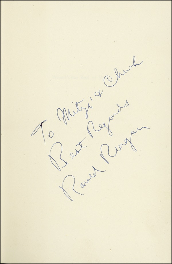 Signed book: Where’s the Rest of Me?. NY: Duell, Sloan and Pierce, 1965. Hardcover with dustjacket, 5.75 x 8.25, 316 pages. Signed in ballpoint on the front free end page, “To Mitzi and Chuck, Best regards, Ronald Reagan.” In very fine condition. R&R COA.