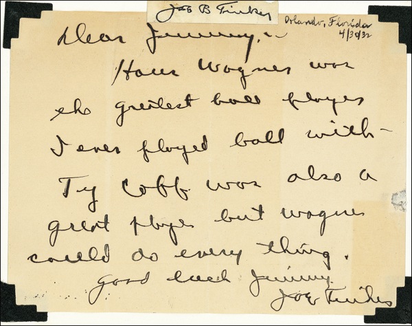 Shortstop (1880–1948) for the Chicago Cubs who made up one third of the legendary Tinker-Evers-Chance double-play combination. ALS, one page, 5.25 x 4, dated in another hand April 30, 1932. Tinker writes to a fan. In full: “Honus Wagner was the greatest ball player I ever played ball with—Ty Cobb was also a great player but Wagner could do every thing. Good luck Jimmy.” In very good condition, with mounting tabs to corners, small slip affixed to top edge, tiny marginal adhesive remnant, and small area of mild toning touching part of last name. The writing is clear and dark throughout. Auction LOA Steve Grad/PSA/DNA and R&R COA.