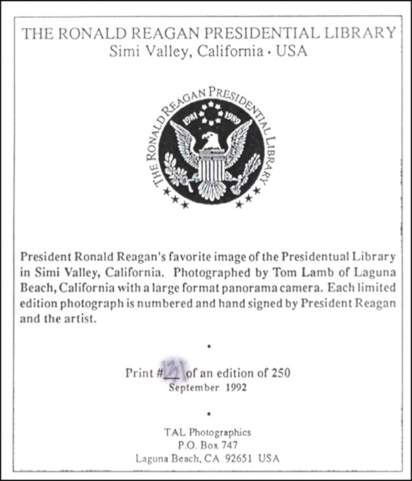 Very attractive color glossy 17 x 8 limited edition print of the Ronald Reagan Presidential Library, one of the very first prints issued by the Library, 131/250, signed in the lower border in black felt tip, “Ronald Reagan,” and also signed and numbered by the artist Tom Lamb. Double matted to an overall size of 19.75 x 12. In fine condition and accompanied by the original certificate from the Reagan Library. R&R COA.