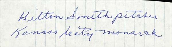 Famed Negro league pitcher (1907–1983), known for what many experts regard as the best curveball in baseball history, who was inducted into the Hall of Fame in 2001. Scarce ballpoint signature, “Hilton Smith pitcher Kansas City Monarch,” on a lightly lined off-white 4.25 x 1.25 slip. In fine, fresh condition. Auction LOA Steve Grad/PSA/DNA and R&R COA.