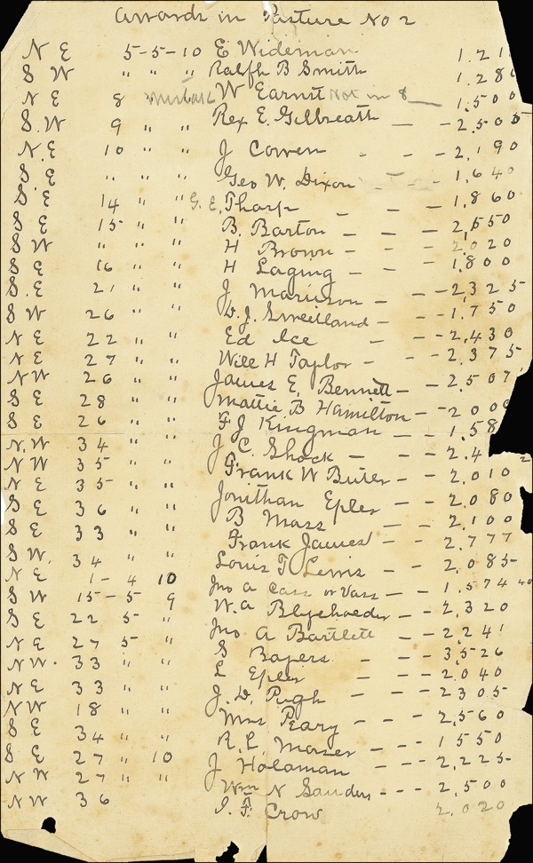 American outlaw (1843–1915) who was a member of older brother Jesse’s notorious gang. After Jesse’s murder in 1882, Frank made a personal appeal to the Governor of Missouri and vowed to go straight. He lived out the remainder of his life in a somewhat less bloody fashion, working variously as a shoe salesman, theater guard, and “legit” betting commissioner. Scarce ADS, one page, 6.5 x 10.5, no date. A handwritten roster of “Awards in Pasture No. 2” in which James lists himself “Frank James” and specifies a parcel of land he owns [in Cado County, Oklahoma], as well as the names and holdings of thirty-three of his neighbors. Though brother Jesse takes top prize among Old West rarities, Frank’s autograph material is quite elusive, and documents or letters of this length are of the greatest scarcity. Accompanied by two engraved explanatory plaques. In good condition, with folds (partial separations) and scattered wrinkles and light stains, and chips and tears to edges (affecting numbers of a few entries). James’ name (and the other names) are dark, fully legible, and mostly unaffected. Auction LOA John Reznikoff/PSA/DNA and R&R COA.
