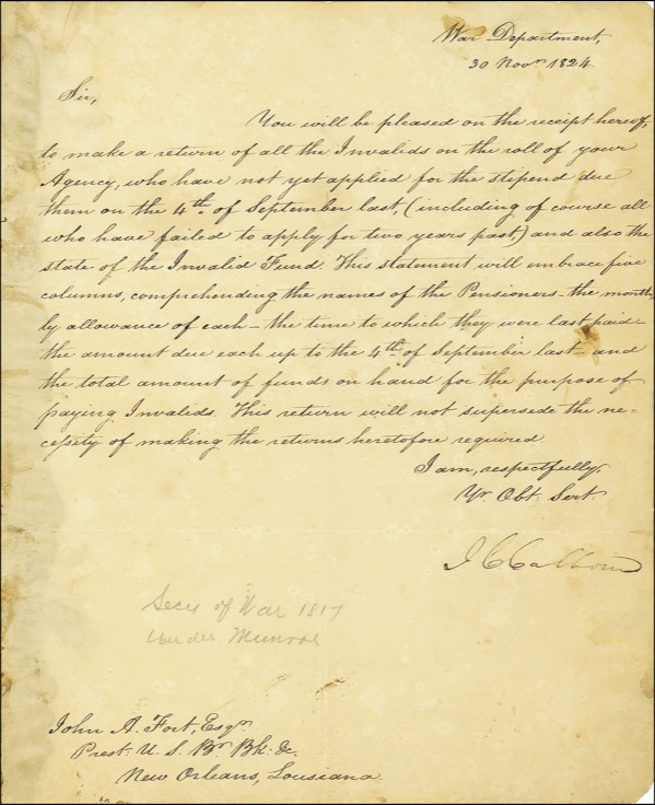 Prominent American politician (1782–1850) who served as vice president under John Quincy Adams and Andrew Jackson and later wielded great power and influence in the Senate as a champion of Southern causes, including slavery. LS signed “J. C. Calhoun,” one page, 8 x 9.75, November 30, 1824. Calhoun, as Secretary of War, writes to John A. Fort in New Orleans. In part: “You will be pleased … to make a return of all the Invalids on the roll of your Agency, who have not yet applied for the stipend due them on the 4th of September last … and also the state of the Invalid Fund. This statement will embrace five columns, comprehending the names of the Pensioners—the month, by allowance of each—the time to which they were last paid—the amount due each….” In very good condition, with scattered soiling, staining, and wrinkling, and glue remnant to reverse showing through in left margin. . R&R COA.