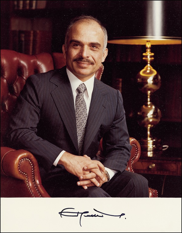 Color satin-finish 7.5 x 9.5 photo, signed in black felt tip in the blank lower margin. Accompanied by the original mailing envelope and a 1982 letter of transmittal from Hussein’s secretary. In very fine condition. R&R COA.