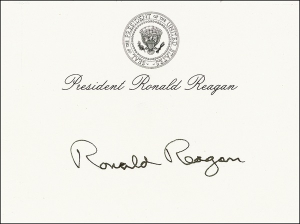 Black ink signature, “Ronald Reagan,” on Reagan’s personal off-white 4 x 3 “Post-It” sheet with printed presidential seal. Following his presidency, Reagan pre-signed these sheets and carried them around with him as a way of easily complying with requests for autographs. In fine condition. R&R COA.