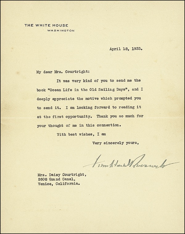 TLS as president, one page, 7 x 9, White House letterhead, April 18, 1933. Letter of thanks for a sent book. In part, “It was very kind of you to send me the book ‘Ocean Life in the Old Sailing Days,’ and I deeply appreciate the motive which prompted you to send it…Thank you so much for your thought of me in this connection.” Accompanied by the original mailing envelope. In fine condition, with an even shade of overall toning and a bit of light foxing. Auction LOA John Reznikoff/PSA/DNA and R&R COA.