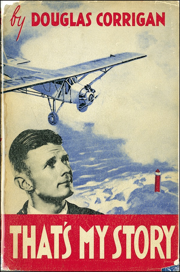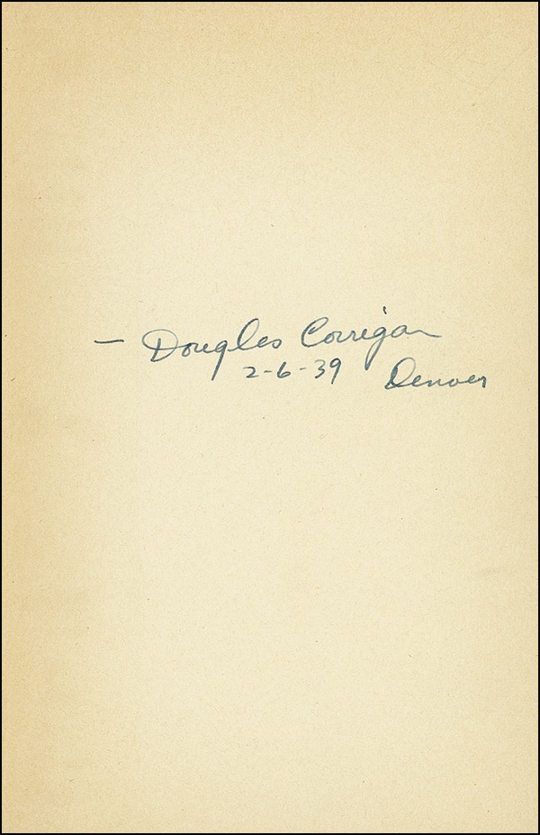 Pilot famed for a navigational error that landed him in Dublin instead of his intended destination of California. Signed book: That’s My Story. NY: E. P. Dutton and Company, 1938. Hardcover with dustjacket, 5.5 x 8.5, 221 pages. Signed in fountain pen on the first free end page, “Douglas Corrigan 2-6-39, Denver.” In fine condition, with a mild shade of toning to signed page and some light wear to dustjacket. R&R COA.