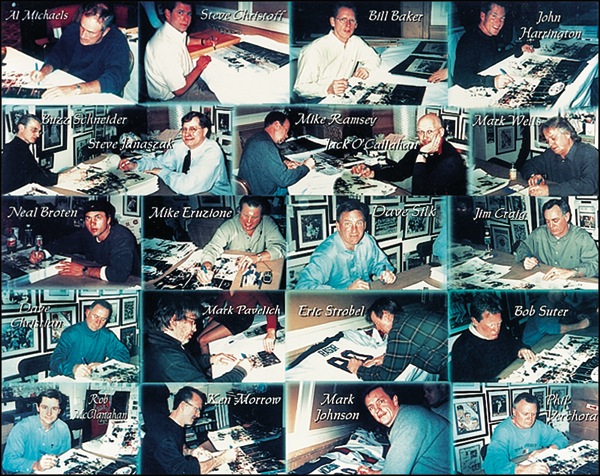 Emotional color 20 x 16 photo of the 1980 Olympic hockey team celebrating their final victory, signed in blue felt tip by 20 members of the team: Mike Eruzione, Jim Craig, Dave Silk, Mark Wells, Steve Christoff, Bill Baker, John Harrington, Buzz Schneider, Steve Janaszak, Mike Ramsey, Jack O’Callahan, Dave Christian, Neal Broten, Mark Pavelich, Eric Strobel, Bob Suter, Rob McClanahan, Ken Morrow, Mark Johnson, and Phil Verchota, with one signer adding “Do you believe in miracles.” Accompanied by a composite photo of all the players taken at time of signing. In very fine condition, with an authentication label affixed to lower right corner. Auction LOA Steve Grad/PSA/DNA and R&R COA.